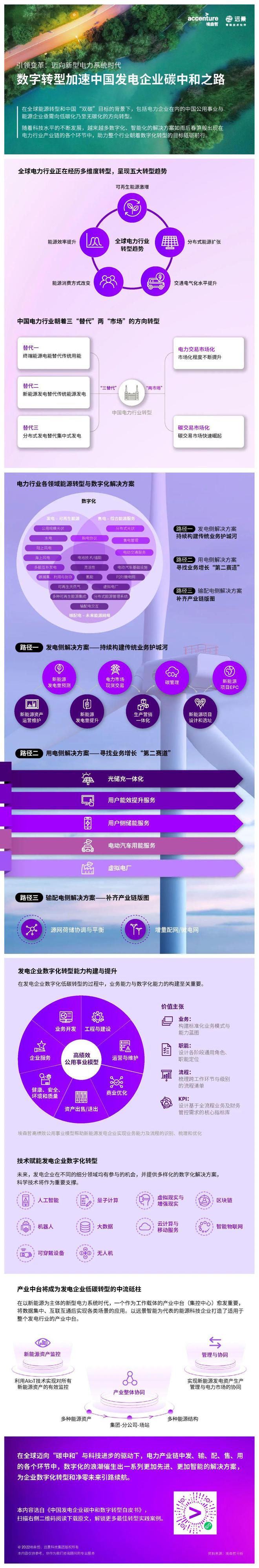 為了應(yīng)對(duì)未來(lái)更加“碎片化”的能源系統(tǒng),滿足消費(fèi)者日益迭代的需求,埃森哲攜手遠(yuǎn)景發(fā)布的《中國(guó)發(fā)電企業(yè)碳中和數(shù)字轉(zhuǎn)型白皮書》勾勒了發(fā)電企業(yè)圍繞發(fā)電、輸配電和用電全產(chǎn)業(yè)鏈構(gòu)建轉(zhuǎn)型路徑,并探討各類數(shù)智化解決方案的應(yīng)用場(chǎng)景。